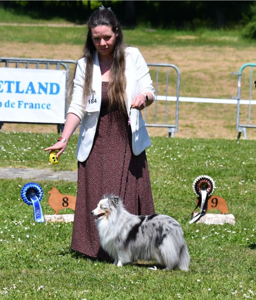 Type agréable, bon museau, bon port d'oreilles, bonne encolure, très beaux yeux, bonne expression, bonne queue, très bien présenté, très belle couleur bleu merle, le mouvement est bon devant et derrière
